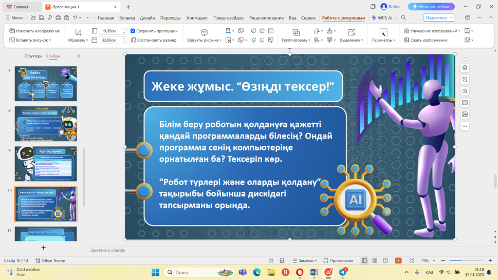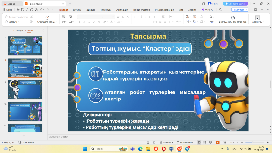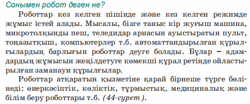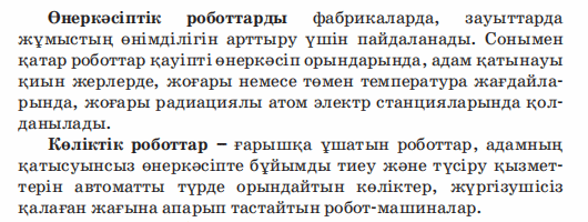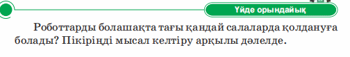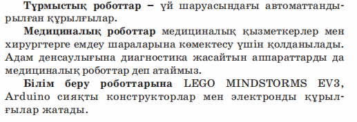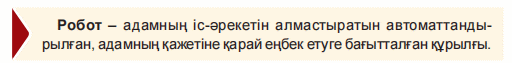 5.3.4.1 робот анықтамасын тұжырымдау; 5.3.4.2 Роботтардың түрлерінің үлгілері және оларды қолдану салаларына мысал келтіру; |
