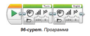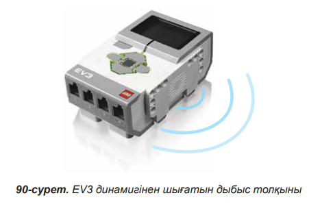 Еске түсірейік! Жанасу датчигі деген не? Сабақтың тақырыбын анықтап, сабақ түсіндіріледі. Роботтар қозғалыс жасап қана қоймай, дыбыстар да шығарады екен. Біз осы сабақта EV3 роботының дыбыстық болгымен танысамыз. Программада аудиофайлды жүктеп, роботтың дыбыс шығаруын еститін боламыз.Дыбыстар EV3 модулінде орналасқан динамиктен шығады. (90-сурет) А Ф 95-сурет.Файл атын енгізу әдісі 1-тапсырма 1.Программа EV3 модулін «Оңға бұрыл» деген екі түрлі дыбыстық файл ойнатып, әрқайсысының аяқталуын күтуі керек. 2.Программа нәтижесін LEGO MINDSTORMS Education EV3-те орында және роботқа жүкте.(96-сурет)