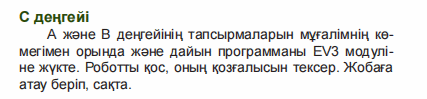 Дискриптор А деңгейіндегі құрастырған роботты пайдаланып кедергіге соқтығысқанда роботты тоқтататын программа құрады - Сергіту сәті» «Бұзық телефон» ойыны Шаттық шеңберге тұрып бастаушы келесі адам құлағына бір сөз сыбырлайды соңында бастаушыға қайта келгенде сол сөз жету керек, кейін сөзді ауыстырып жіберген адам анықталады. EБҚЕ бар балалар үшін тапсырма Жанасу датчигі дегеніміз не? Дескриптор: Сұраққа жауап береді Жеке жұмыс 3- тапсырма Компьютермен жұмыс