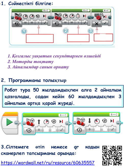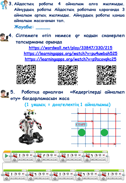 Дескриптор: - бұрылыс санын жазады - сәйкестікті белгілейді - сергіту жаттығуларын жасайды - интерактивті тапсырманы орындайды - роботқа арналған бағдарламаны құрады |