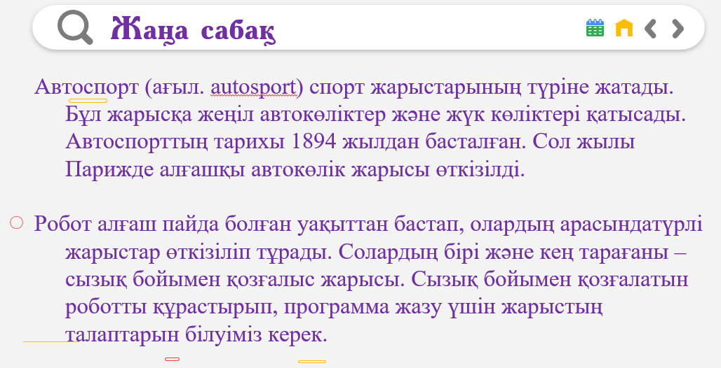 Ұйымдастыру кезеңі. Оқушылармен сәлемдесу, сабаққа қатысуды тексеру. Сыныпта психологиялық қолайлы атмосфераны қалыптастыру. "Көтеріңкі көңіл-күй"тренингі. Оқушылар әр партада бір-біріне жақсы тілектер айтады. Үй тапсырмасын тексеру. Жаңа тақырыпқа кіріспе: - Автокөліктер және роботтар арасында өтетін жарыстардың қандай ұқсастықтары мен айырмашылықтарын айта аласың? (1-сурет)?