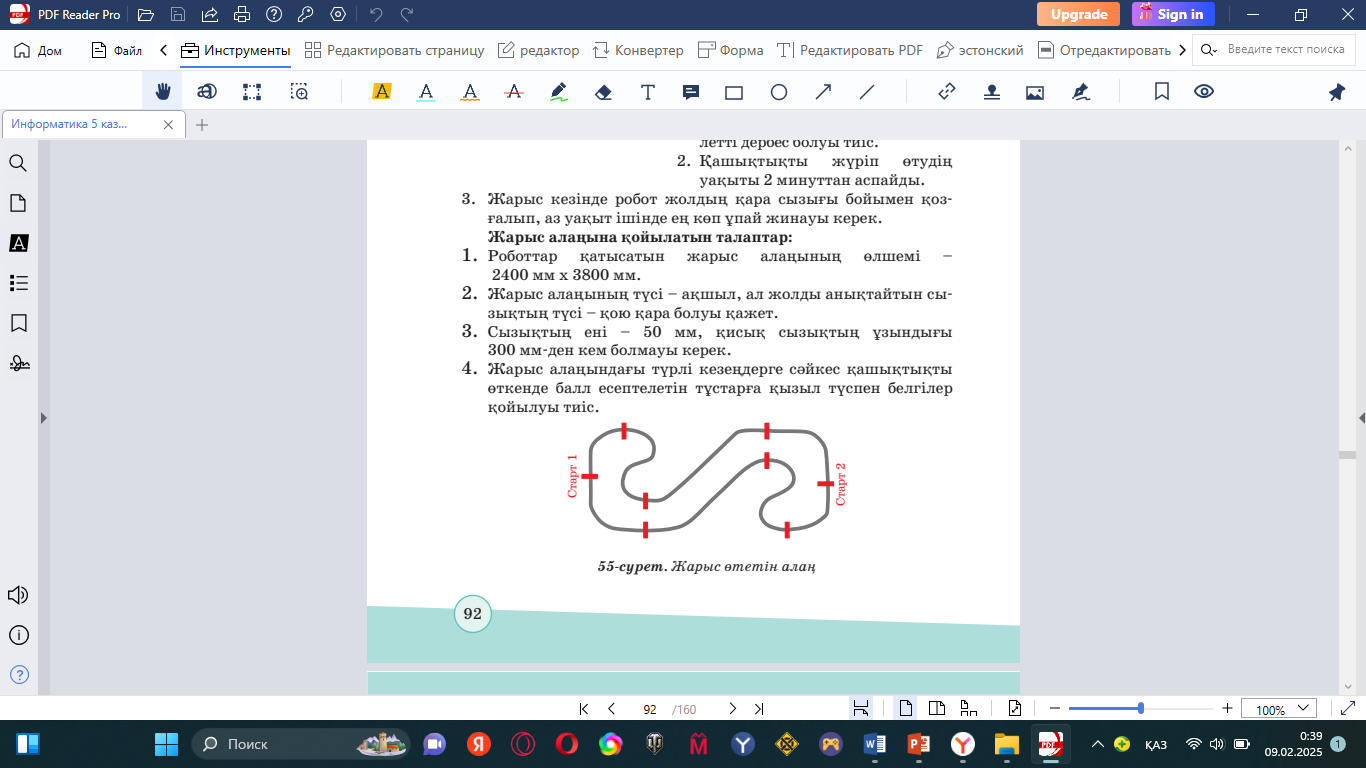 басынан аяғына дейін жүріп өтуге қабілеттідербес болуы тиіс. 2. Қашықтықты жүріп өтудің уақыты 2 минуттан аспайды. 3. Жарыс кезінде робот жолдың қара сызығы бойымен қозғалып, аз уақыт ішінде ең көп ұпай жинауы керек.