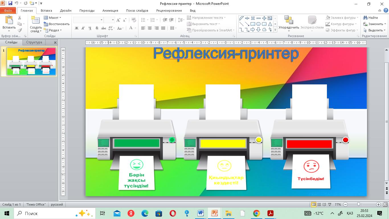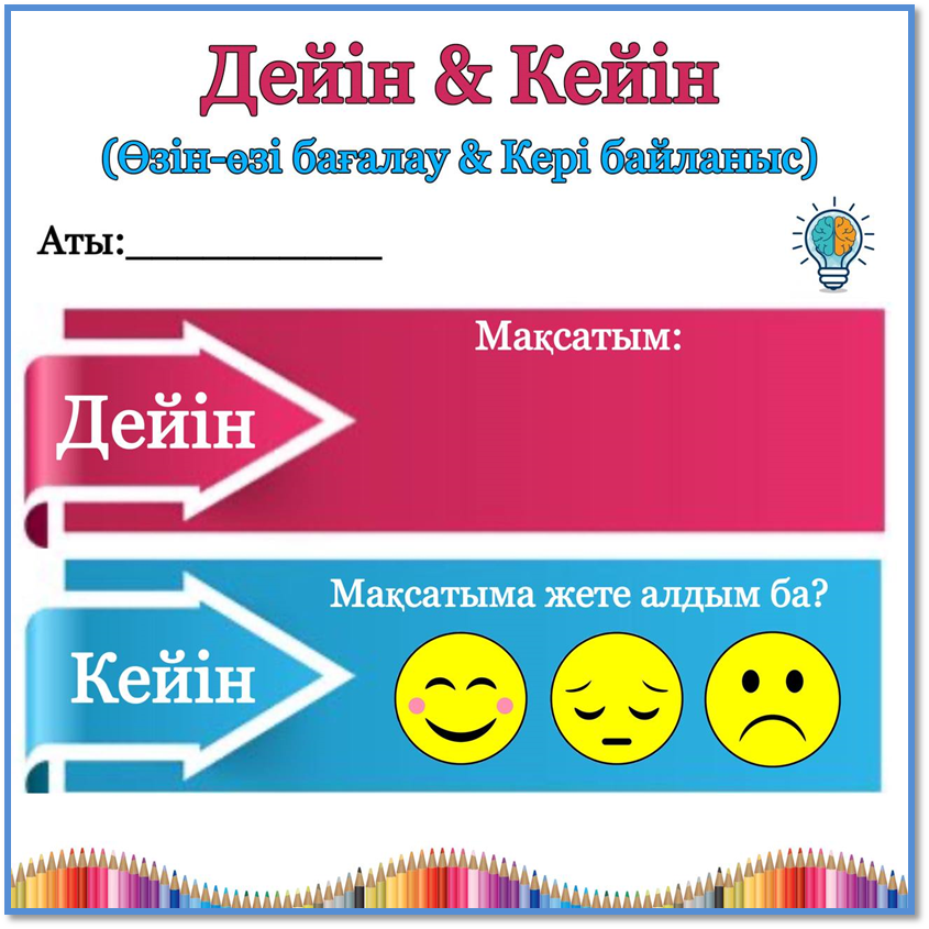 1.Оқушыларға өзін-өзі бағалауды ұйымдастырады. 2.Кері байланыс: «Принтер» , «Дейін &Кейін»