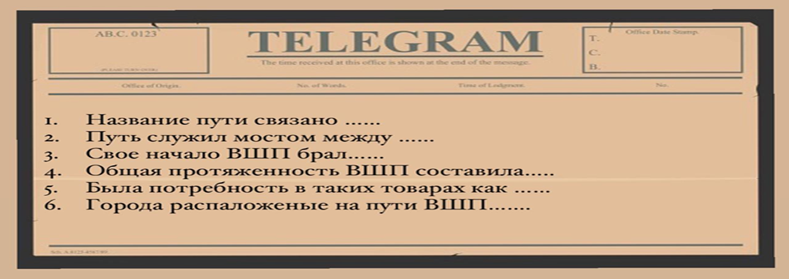 Еще 700 лет назад шейх Саади из Шираза писал: “Путешествуя, радуешь сердце, извлекаешь выгоды, видишь разные диковины, слышишь о чудесах, осматриваешь города, беседуешь с друзьями, расширяешь образование и познания, умножаешь богатство и состояние, знакомишься с людьми и испытываешь судьбу”. Ребята сегодня нам с вами предстоит познакомиться с историей возникновения ВШП. Просмотр Видеоролика про ВШП Задание № 1. Парная работа. посмотрите «Великий Шелковый путь» и заполните шаблон «телеграммы». «Телеграмма»