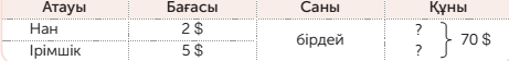 3 топ Нан -2$-дан ?д Ірімшік -5$-дан ?д 70$ Ш: 1) 2+5=7$ 2)70$:7$=10д 3) 2$*10=20$ (нанға) 4) 5$*10=50$ (ірімшікке) Ж: 10 нанға 20$, 10 ірімшікке 50$ төленді. |