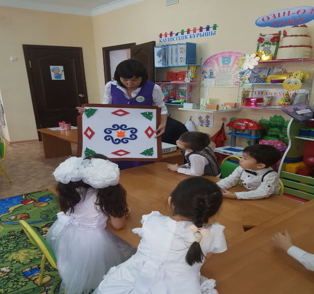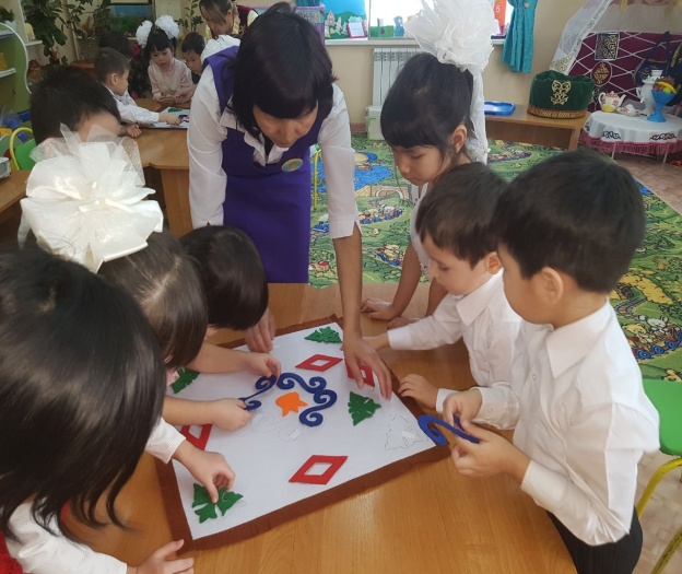 Балалар екі топ болып сырмақ жасауға кіріседі. Қазақша күй ойналып тұрады. Тәрбиеші мен Сұлушаш балалардың жұмыстарын бақылап, жеке балалармен жұмыс жүргізеді.