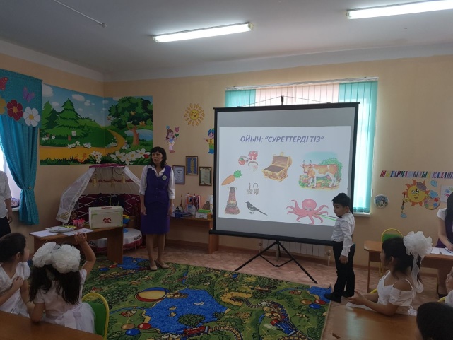 суреттерді қояды да атайды, сосын оларды бірінші дыбысына қарай
