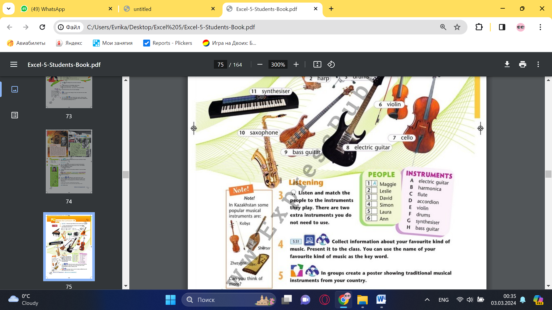 Task. Listen and match the people to the instruments they play. There are two extra instruments you don’t need to use.