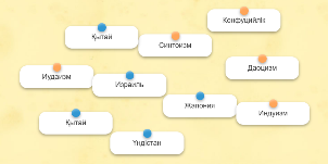 (ТЖ)Топтық жұмыс (оқушыға топқа қатар қылып бөлсеңіздер болады) «Джигсо» әдісі Кескін картаға діндердің таралу аймақтарын анықтайды. Өз елімен салыстырады. Жасанды интеллект арқылы презентация жасайды