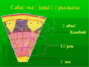 7:1:3:3 Сабақ және тамыр.Сабақтың ішкі құрылысы:қабық,камбий,сүрек,өзек.Тамыр аймақтары:бөліну,өсу,сору және өткізу аймақтары. |