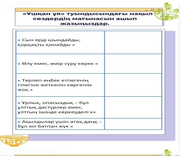 Оқушылар берілген нақыл сөздерге анықтама береді |