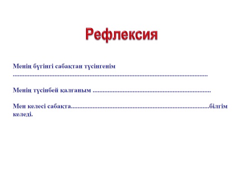 Кері байланыс: Оқушылар бүгінгі сабақта не сәтті өтті, нені жақсы меңгерді, түсінгеніңізді қаншалықты бағалайсыз Үйге тапсырма: § оқу,сөздік |