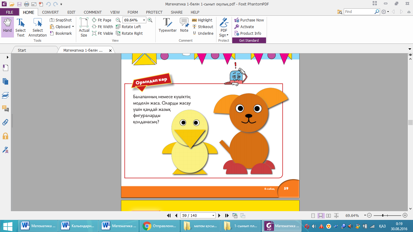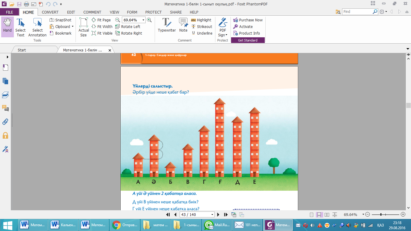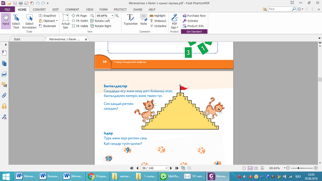 Көңілді клоундар. Тапсырма заттардың реттік санау түсінігін бекітуге мүмкіндік береді. Сынып-пен топтық жұмыс ұйымдастырыңыз. Оқушыларға иллюстрацияға қарап, ондағы клоундардың аттарын оқып, сұрақтарға жауап беруін сұраңыз. Оқушылар тапсырманы орындау барысында заттарды реттік санау санақ басына байланысты болатынын түсініп қорытынды жасайды (санау солдан немесе оңнан, жоғарыдан немесе төменнен, т.с.с.). Тапсырманы орындап болған соң, топпен тексеру жұмысын өткізіңіз. Жауабы: Сопақ; Екінші; Бесінші; Сөлпек; Бармақ. Бірінші. Шығарып көр. Тапсырма реттік сандарды сөйлеуде қолдану дағдысын дамытады. Жұмысты жұппен ұйымдастырыңыз. Оқушылардан “Өз үйле-ріңнің мекенжайын білесіңдер ме?” деп сұраңыз. Олардың жауабын тыңдаңыз. Оларға өз үйінің немесе пәтерінің нөмірін айтқанда реттік санауды қолданатынына назар аудартыңыз. Оқушыларға бір-біріне қай үйде, қай қабатта, қай пәтерде тұратыны туралы айтқызыңыз. Жағдайға байланыс-ты сөйлеуде реттік сандарды дұрыс пайдалануға көмектесіңіз. Одан кейін суреттегі кейіпкерлер қай қабатта тұратынын табуды ұсыныңыз. Сұрақ-тар ойлап, оны бір-біріне қойғызыңыз. Сұрақтар мынадай болуы мүмкін: “Киініп далаға шықпақшы болып тұрған ұл бала қай қабатта тұрады?”, “Телефонмен сөйлесіп тұрған қыз бала қай қабатта тұрады?” және т.с.с. Жауабы: Алтыншы қабатта; Оныншы; Бірінші және оныншы қабатта; Тотықұс. Орындап көр. Оқушыларға бірінші партадан бастап санауды тапсырыңыз. Оқушылар жұпта жұмыс істей алады: біреуі тура ретпен санайды, екіншісі кері ретпен санайды. Ойлан. Оқушылар күнделікті өмірде кездесетін реттік санауға байланысты жағдайларды естеріне түсіріп, мысалдар келтіреді. |