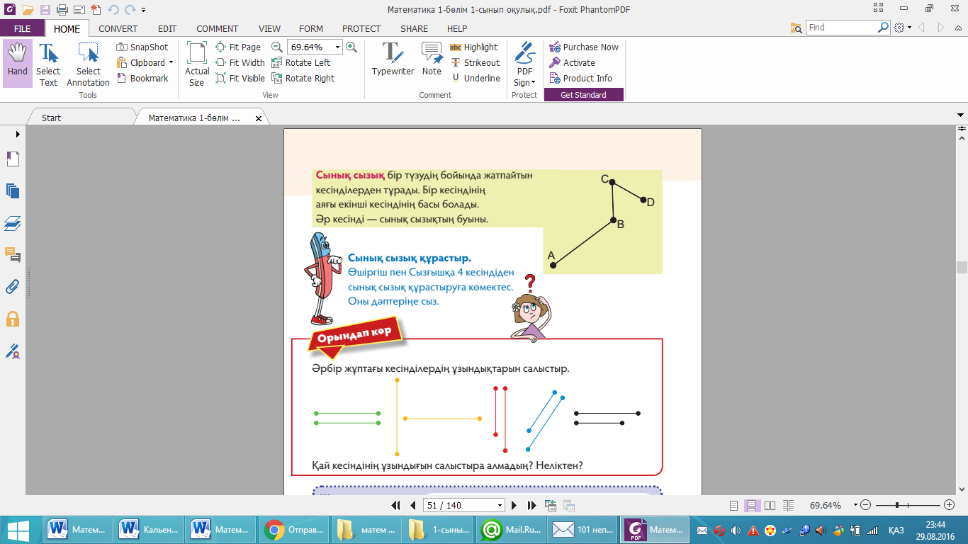 Шығарып көр. Тапсырманы орындамас бұрын кесінділерді өлшеу кезіндегі сызғышты пайдалану ережесін қайталатыңыз. Өлшейтін заттың шеті сызғыштағы 0 санымен сәйкес келуіне оқушылардың назарын аударыңыз.