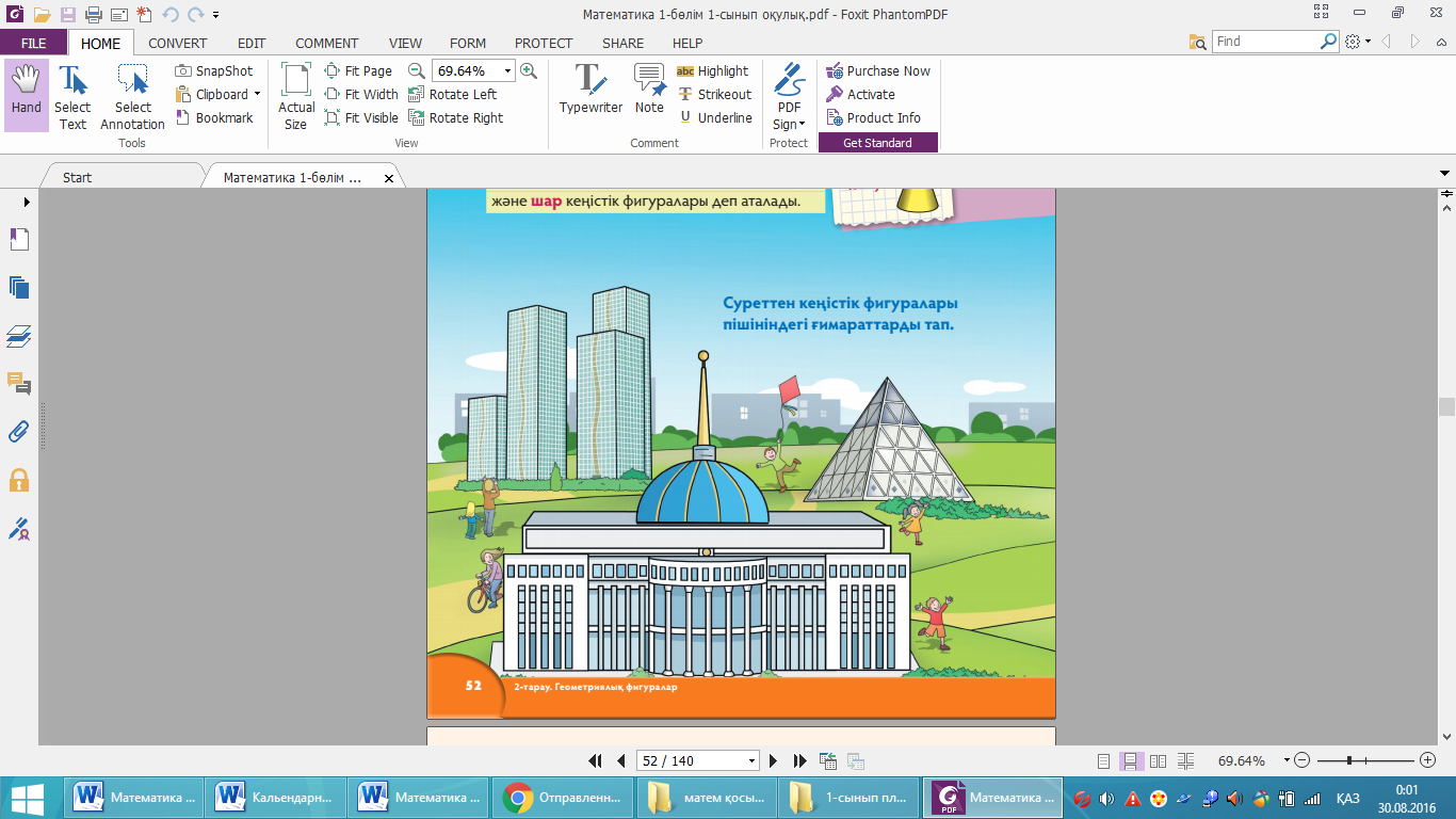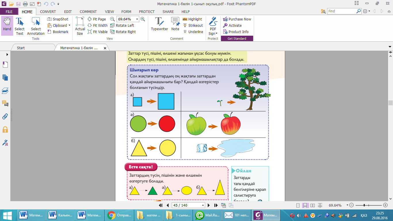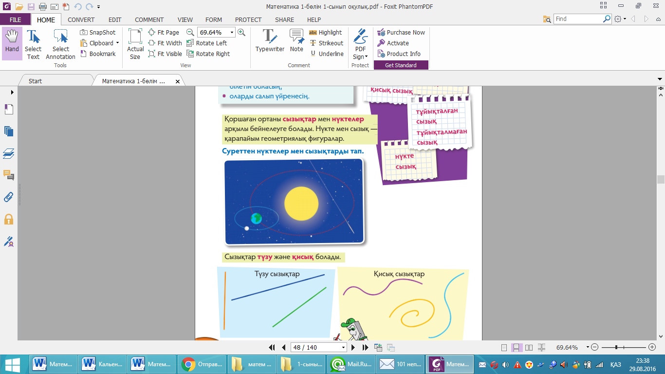 Шығарып көр. Оқушыларға оқулықтағы суретті қарауды сұраңыз. Кесінділерді тауып, оларды атауды ұсыныңыз. Кесіндінің сәуле мен түзуден айырмашылығы қандай екенін сұраңыз. (Кесіндінің ұзындығын өлшеуге болады, ал сәуле мен түзу шексіз.) Осыдан кейін өз беттерінше орындауға кесіндінің ұзындығын сантиметрмен анықтайтын жұмысты беріңіз. Бір литр сүттің, шыны құтыдағы кетчуп пен алмұрттың массасын тап. Тапсырма тәжірибе арқылы оқушылардың логикалық қабілеттерін арт тыруға бағытталған. Берілген тапсырманы жұппен орындауды ұсыныңыз. Жауабы: дұрыс жауаптың үш нұсқасы болуы мүмкін: 2 бөтелке; 1 литр сүт және 1 алмұрт; 3 алмұрт. Орындап көр. Сыныптан немесе үйден масса-сын, ұзындығын, көлемін өлшеуге болатын заттарды табуды ұсыныңыз. Топпен орындауға нұсқау беріңіз. Жауабы: ықтимал жауаптар: аквариумның, құмыраның, стақанның массасын, көлемін, биіктігін өлшеуге болады.
