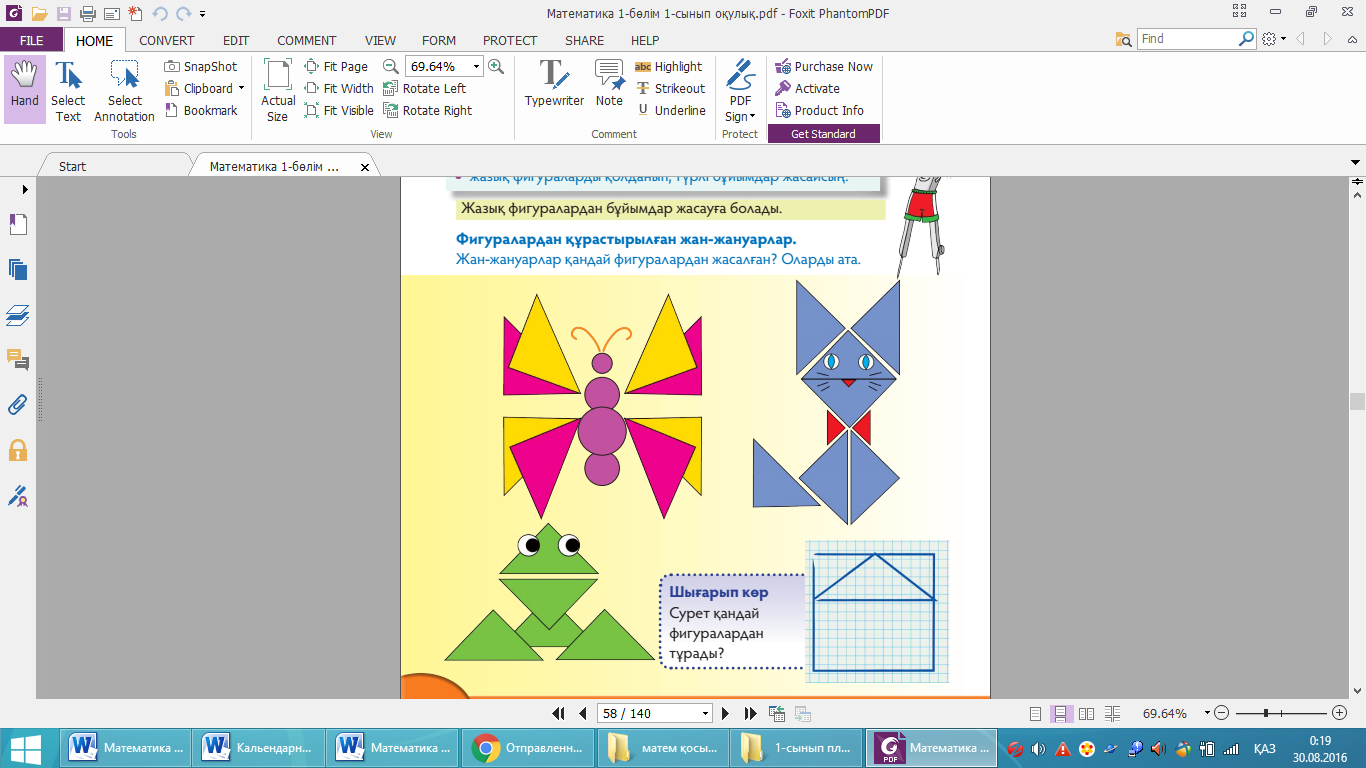 Қай топтағы заттар артық? Оқушылар жоғарғы және төменгі қатарларда-ғы бірдей заттарды санайды да, қай топта заттар көп болса, сол топты айналдыра қоршап сызады. Иллюстрацияның оң жағына нәтижесін “>”, “<” белгілерінің көмегімен жазуы тиіс. Жауабы: а) 5 алманы қоршап сызу керек (5 > 4); ә) 10 араны қоршап сызу керек (10 > 8). Қай топтағы фигуралардың саны кем? Оқушылар сол және оң жақта орналасқан топ-тардағы заттарды санауы тиіс және фигуралар саны аз топты бояйды. Иллюстрацияның оң жағына нәтижесін “>”, “<” белгілерімен жазуы тиіс. Жауабы: а) 6 дөңгелекті қоршап сызу керек (6 < 9); ә) 5 үшбұрышты қоршап сызу керек (5 < 10). Бос орындарға сандарды қой. Оқушылар 10 көлеміндегі заттардың санын салыстырып, сөйлемдегі бос орындарды толтырады. Соңғы жолда салыстыруға сандар берілген жоқ. Оқушылар кез келген санды таңдап алып, өзара салыстырады. Мұндай тәсіл оқушылардың матема-тикалық ойлауын дамытуға көмектеседі. Жауабы: 5 > 4, 3, 2, 1, 0; 10 > 9, 8, 7, 6, 5, 4, 3, 2, 1; 1 < 2, 3, 4, 5, 6, 7, 8, 9, 10. |