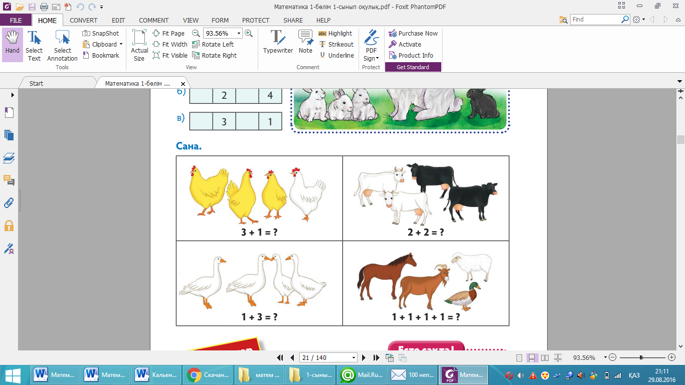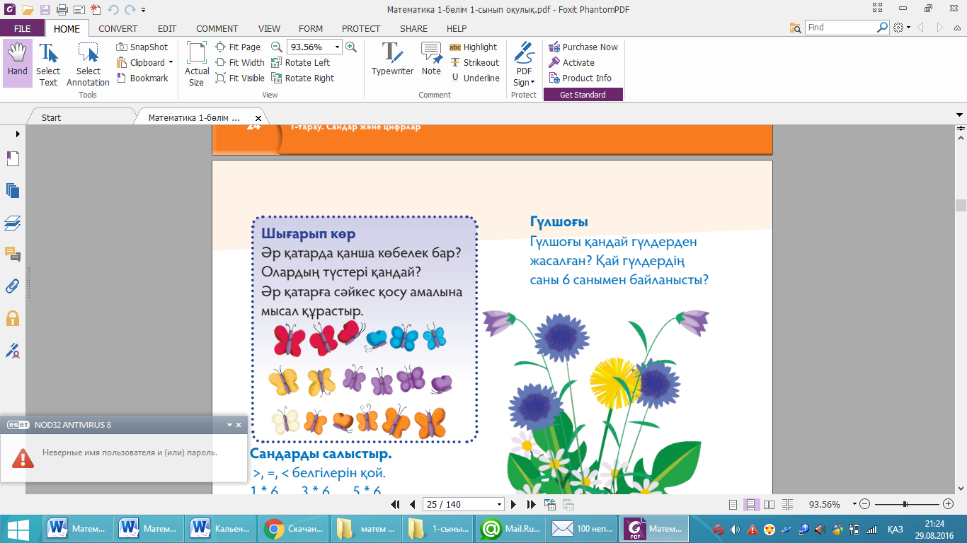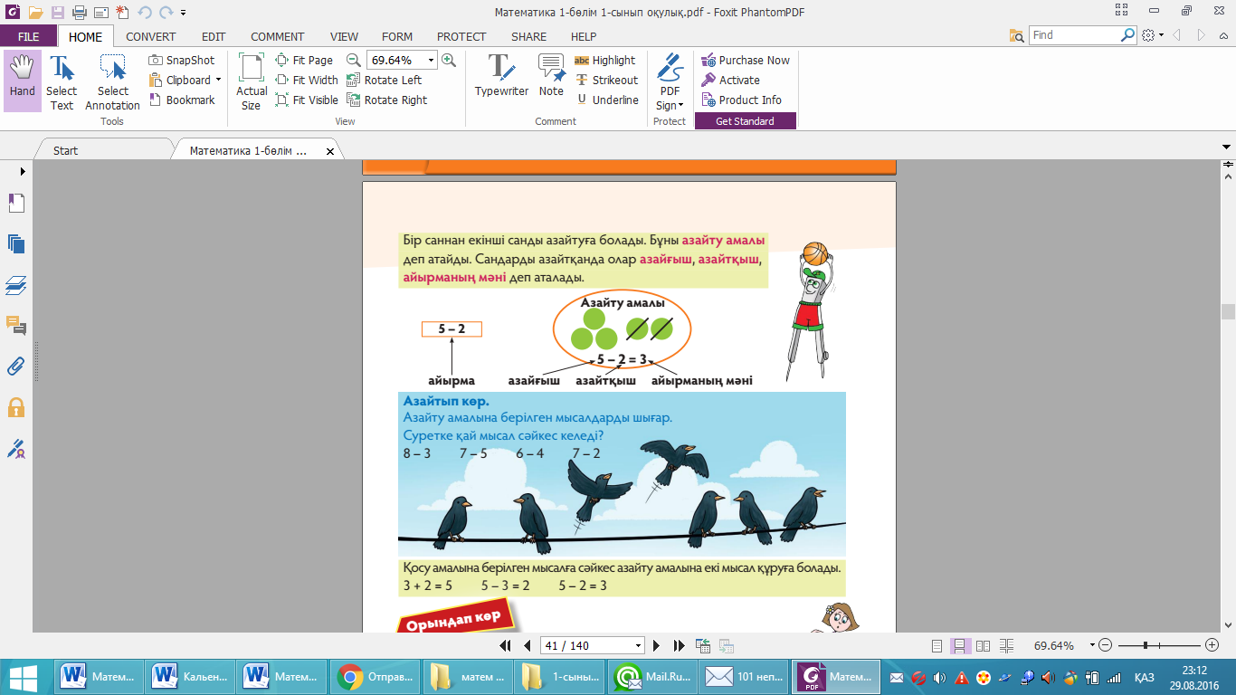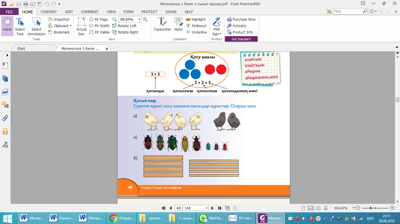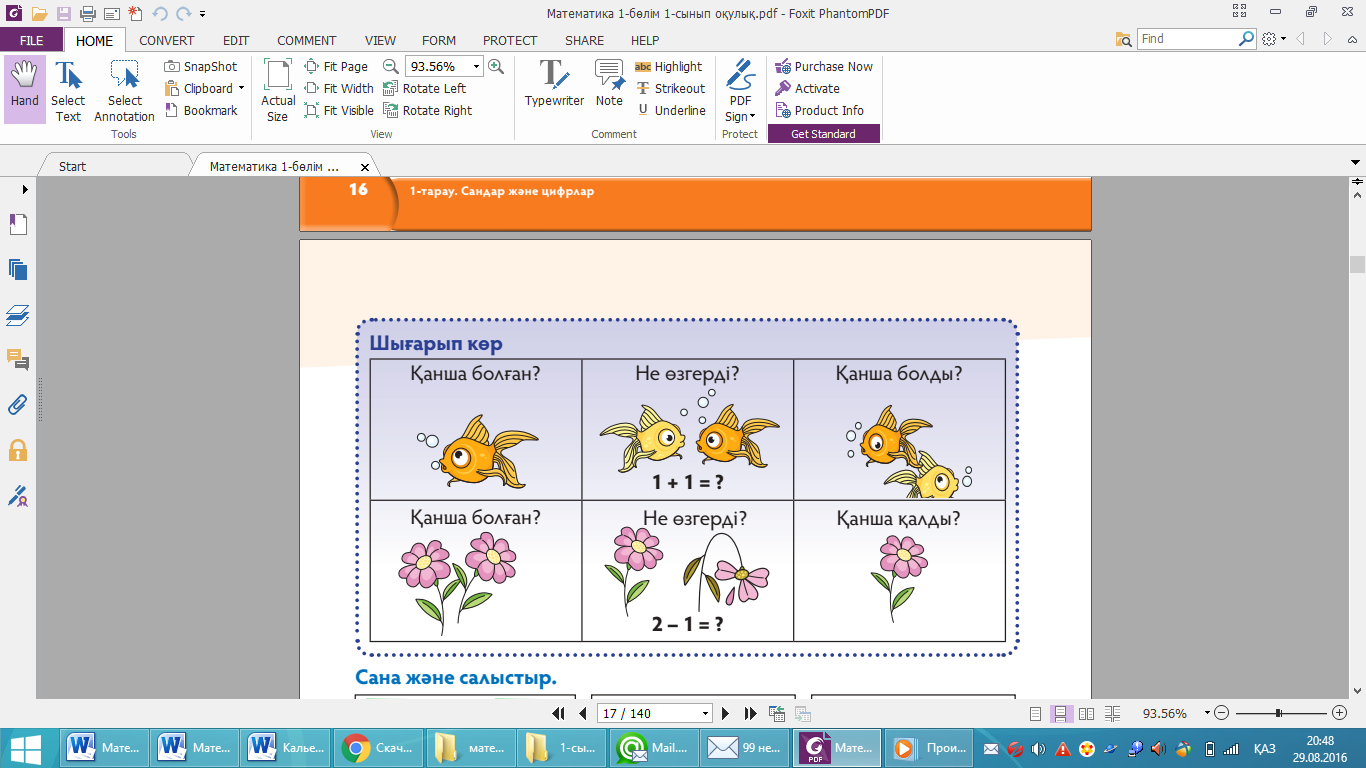Мектеп сөмкесін жинауға көмектес. Тапсыр-ма көп заттардың ішінен саны біреу ғана болып тұрған затты табуға арналған. Oқушыдан басқа заттарды емес, неге осы затты таңдағанын түсіндіру-ді сұраңыз. Жауабы: күнделiк, қаламсауыт, сызғыш, альбом, қалам, қарындаш. Қатені тап. Берілген тапсырманы орындау үшін жұптық жұмыс ұйымдастырыңыз. Оқушылардан суреттегі қатені табуды сұраңыз. Олар диалог барысында кейбір суреттердегі заттардың саны көрсетілген цифрларға сай келмейтінін табады. Яғни қатені табады және тапсырманы орындайды. Орындап көр. Оқушыларға топпен жұмыс іс-теуді ұсынып, соңынан өздерінің байқағанын топ ішінде қорытындылап, өз пікірін қорғауға мүмкіндік беріңіз. Жауабы: мысал ретінде тақта, есік, компьютер және т.б. алуға болады. Суреттен саны 1-ге тең болатын заттарды тап. Жұппен орындалатын тапсырма. Саны 1-ге тең заттарды тауып атайды. Тексеру барысында кей-бір жұптар жауаптарын атайды, қалғандары кері байланыс үшін тиісті түстегі парақшаны көрсетеді: жасыл түс — дұрыс, қызыл түс — қате. Жауабы: киіз үй, әже, ер адам, құлын, ұл бала, қыз бала, қорап. Гүлдер мен көбелектер саны бірдей ме? Оқушылар суретте көрсетілген әрбір гүлге бір-бір көбелектен келетіндей сәйкестендіріп, жауаптарын парталас көршісімен жұп болып талдайды да, өз пікірін айтады. Жауабы: барлық көбелектерге жетпейді, бір көбелек гүлсіз қалып қояды. Шығарып көр. Арман мен Айнұр қораптан кезек-кезек кәмпит алды. Бірінші кәмпитті Арман, екіншісін Айнұр және т.с.с. алып тауысады. Соңғы кәмпитті кім алады? Кәмпиттің көбі кімге тиеді? Кәмпиттердің орнына қағаздан жасалған дөңге-лектерді пайдаланып, оқулықтағы “Шығарып көр” айдарындағы тапсырманы сыныпта оқушылармен тәжірибе жасай отырып өткізіңіз. Жауабы: Арман соңғы кәмпитті алады. Оған үш кәмпит, ал Айнұрға — екі кәмпит тиеді. |