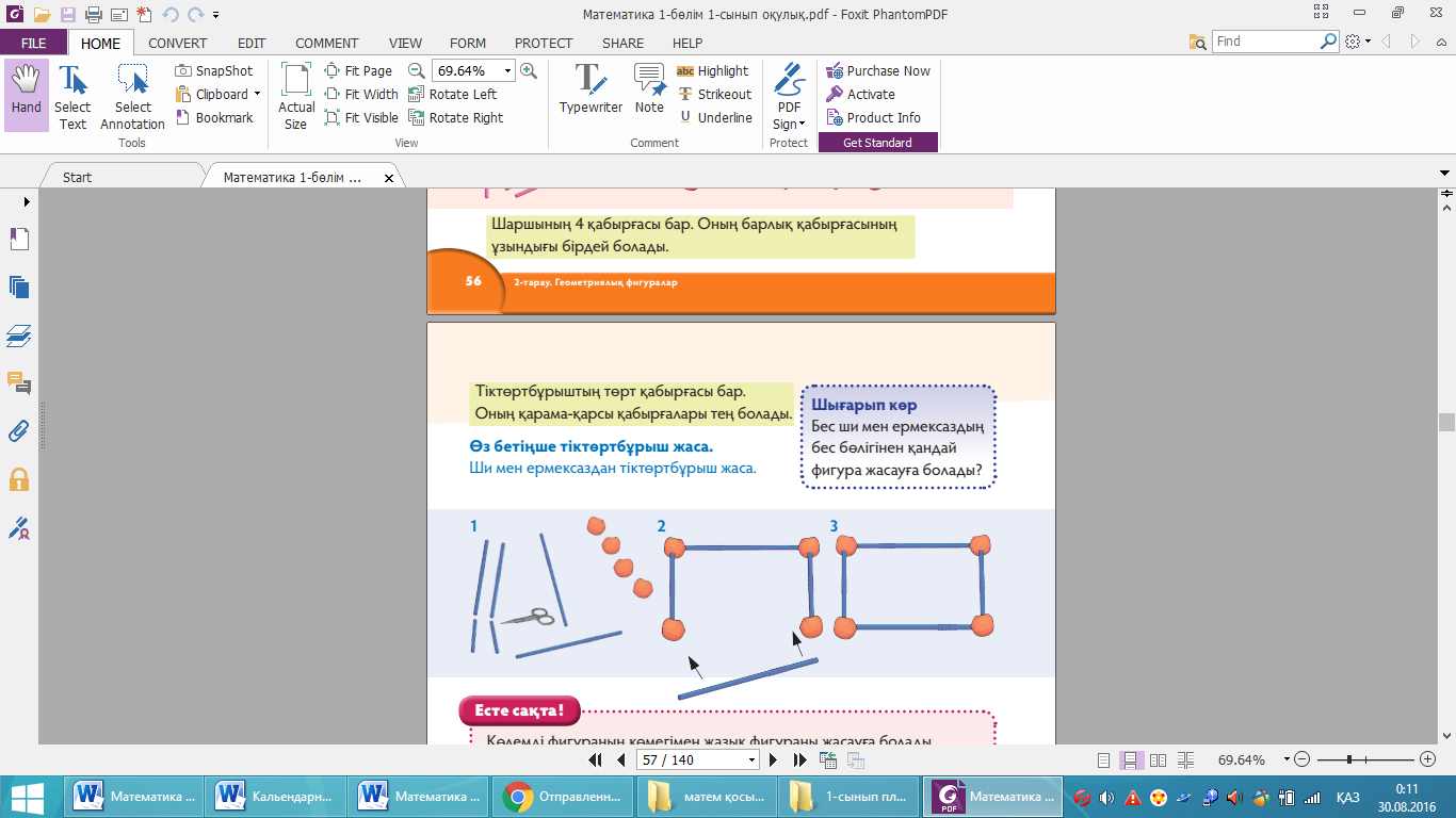 Қалам мен қойындәптердің ұзындығын өлше. Тапсырма ұзындықты стандартты емес өлше-уіштермен өлшеу дағдысын бекітуге берілген. Қай үстел ұзын? Бұл тапсырма оқушылардың логикалық қабілеттерін дамытады.
