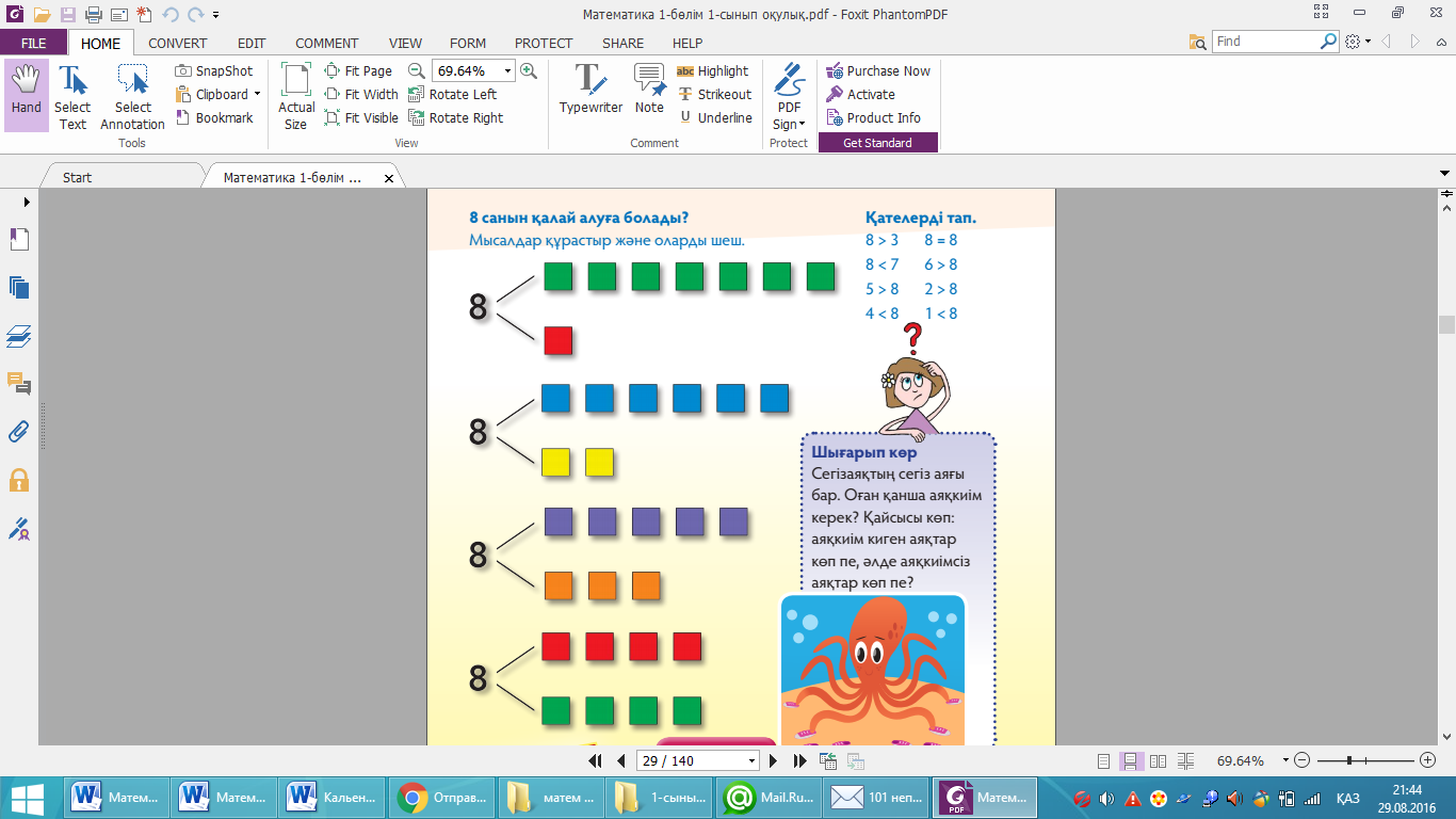 Шығарып көр. Оқушыларға жұппен жұмыс жа-сай отырып, суретке қарауды ұсыныңыз. Оқушылар-дан “Аю бал құмыраларын дұрыс қойған ба?” деп сұраңыз. Оқушылар өз жауаптарын айтулары ке-рек. Талқылау барысында олар құмыралар дұ-рыс емес қойылған деген қорытынды жасайды және біріншіден жетінші құмыраға дейін немесе кері ретпен жетіншіден бірінші құмыраға дейін орналастырулары керек. “Барлық құмыра ретімен тұру үшін қайсыларының орындарын ауыстыру қажет?” деп сұраңыз. Жауабы: дұрыс емес. Орындап көр. Парақшаларды ретімен орна-ластыр. Оқушыларға оқулықтағы доминоның суретін қа-рауды ұсыныңыз. Әр доминода қанша нүкте барын сұраңыз. Балалардан домино тастары топтамасын оқулықта көрсетілген ретпен орналастыруды сұ-раңыз. Қалай орындалғанын жұп болып тексеруді ұсыныңыз. Оқушыларға мынадай сұрақтар қойыңыз: — Бір нүктесі бар тасты табыңдар; — Келесі таста қанша нүкте бар? (Жауап: екі.) Яғни 1-ден кейін 2 болады, 2-ден кейін 3 болады және т.с.с. Оқушылардың назарын барлық сандардың ре-тімен орналасатынына және әр санның өз орны болатынына аударыңыз. 6, 4 және т.б. сандардан соң қандай сандар болатынын айтуды сұраңыз. Көрсетілген саннан кейін тұрған сан “келесі сан” деп аталатынын түсіндіріңіз. 8, 3, 6 сандарының ал-дында қандай сандар орналасу керектігін сұраңыз. Көрсетілген сандардың алдында тұрған сандарды “алдыңғы сан” деп түсіндіріңіз. “Көрші” ойынын ойнатыңыз: қандай да бір санның “көршілерін” атаңыз және оқушылардан оның қай сан екенін табуды сұраңыз. Мысалы, “Бұл сан 5 пен 7 арасында тұр, оның атын ата” немесе “Бұл санның көршілері 3 пен 5”. Сандық сәулеге сүйене отырып, жұмысты орындатыңыз.