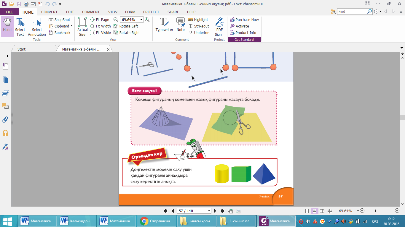 Қай шаманы өлшегенін анықта. Сөздерді тиісті суреттермен сәйкестендіріп, сызықпен қос. Оқушылар шамаларды ұзындық, көлем, массаны бейнелейтін суреттерге сәйкес келетін сөздерді сызықтармен қосу керек. Шамаларды тиісті өлшем бірліктермен сәй-кестендір. Оқушылар шамалардың атауларын (ұзындықты, массаны, көлемді) олардың өлшем бірліктерімен сәйкестендіріп қосу керек. Айнаның ұзындығын әртүрлі өлшеуіштер-мен анықта. Оқушылар қойындәптер түрінде және қарындаш түрінде көрсетілген өлшеуіштің санын табуы керек. Айнаның ұзындығы қойындәптердің ұзындығымен 6 болады. Ал бір қойындәптердің ұзындығы 2 қарындаштың ұзындығына тең болған-дықтан, айнаның ұзындығы қарындаштардың ұзын-дығымен 12-ге тең болады. |