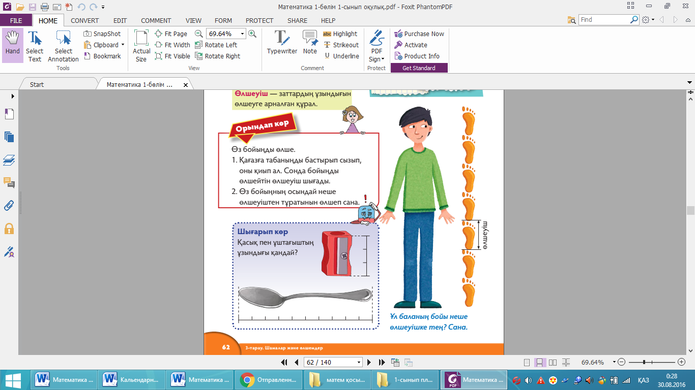 Орындап көр. Бұл айдардағы тапсырманы сабақтың басында “өлшеуіш” ұғымын енгізу үшін орындату керек. Ол үшін жұппен жұмыс ұйымдас-тырыңыз.