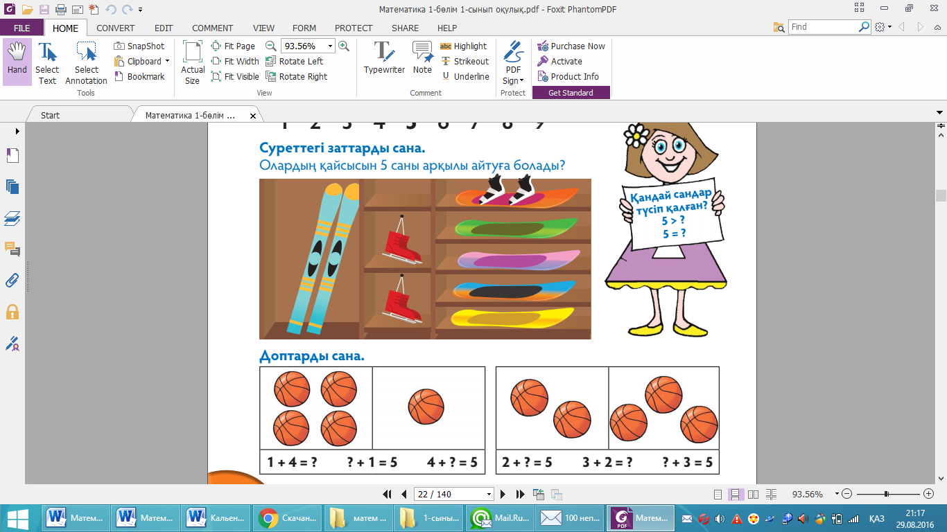 Дұрыстап санап көр. Берілген тапсырма зат-тарды санау кезінде сандық санау мен реттік са-наудың айырмашылығын ажыратуды жаттықтыруға бағытталған. Оқушылар өз беттерінше қанша затты бір қарындашпен бояу керектігін және нешінші затты басқа қарындашпен қоршап сызу керектігін анықтауы тиіс. Ж Жауабы: бірінші — Әнуар; екінші — Әлiмхан; үшінші — Мансұр; төртінші — Ілияс; бесінші — Данияр; |