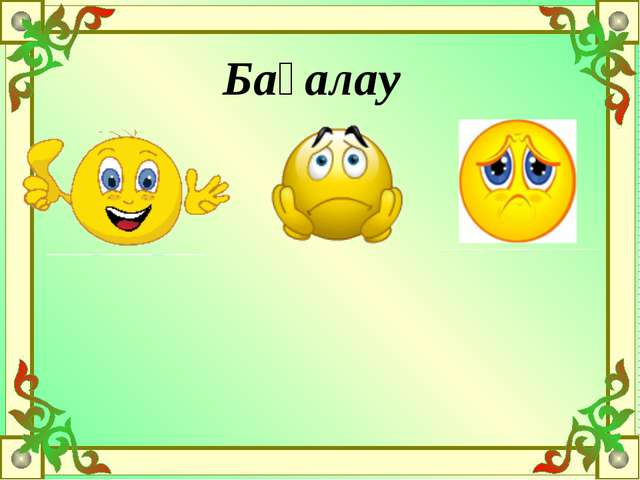 Бағалау – оқушылардыңматериалдымеңгерудеңгейінқалайтексеруді жоспарлайсыз? Әрбір сабақ кезеңі барысында мұғалімнің тиімді және конструктивті кері байланыс беріледі.Топтық жұмыс барысында дайын жауаптар бойынша "Күлегештер арқылы"өзіндік жұмыс бірін-бірі бағалайды.