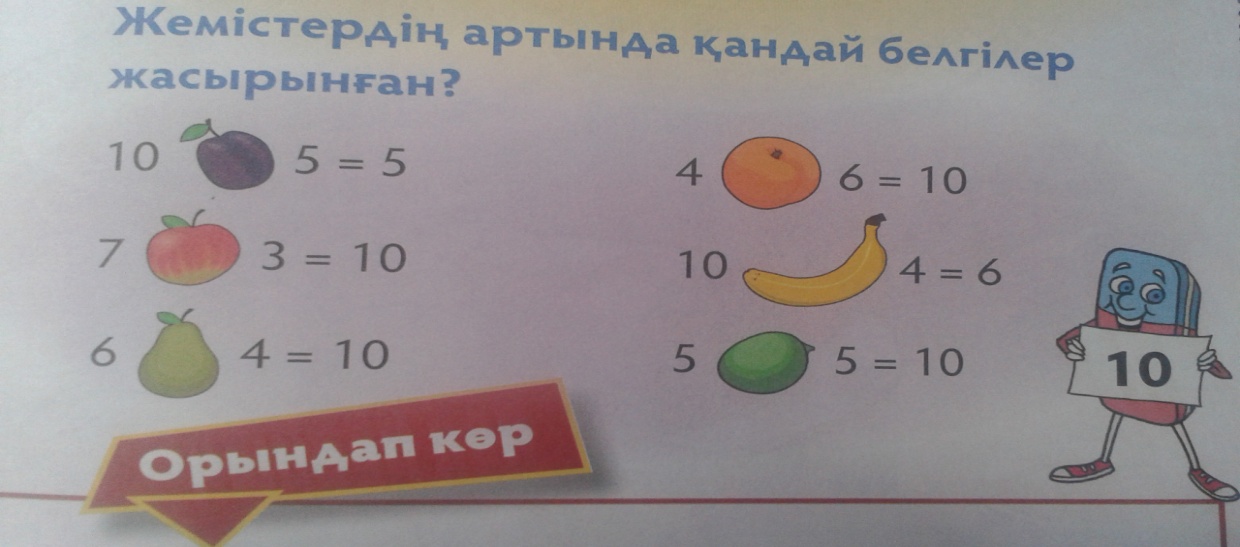 - 10-ға дейінгі сандарды пайдаланып өрнек құрап үйренеді.-Натурал сандарды ажыратады |