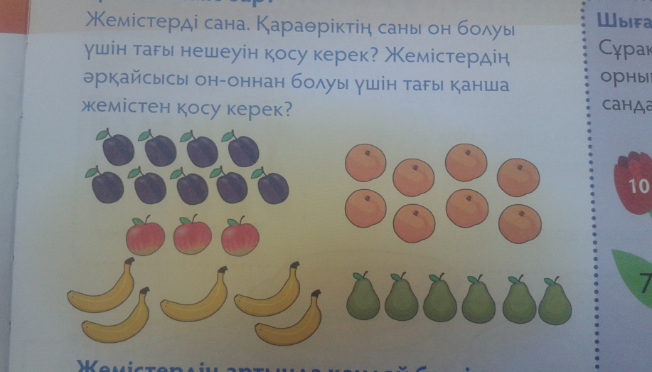 Сергіту сәті : Санамақ Бір дегенім-білім Екі дегенім -елім Үш дегенім -үміт Төрт дегенім -төзім Бес дегенім -бақыт Алты дегенім -ақыл Жеті дегенім -жалау Сегіз дегенім -сезім Тоғыз дегенім -тоқтау Он дегенім -Отан, Қорға соны ботам. "Санамақ"өлеңін 3 жанрда айту І топ "Эстрада"жанрында ІІ топ "Рэп" жанрында ІІІ топ "Айтыс" жанрында 2-тапсырма (Сараланган тапсырма) І - топ Суреттердегі жемістерді санап, санын 10-ға толтыр