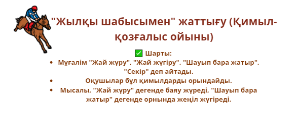 Мұғалімнің айтқанын қайталайды Өткенді пысықтайды Пікір білдіреді Жеке жұмыс жасайды Тапсырманы орындайды Сұрақтар жазады Жеке жұмыс жасайды Би қимылдарын жасады Қалпақ әдісімен сұрақтарға жауап жазады Жеке жұмыс жасайды Топ бойынша жұмыс жасайды Үй тапсырмасын орындайды Кері байланыс жасайды |