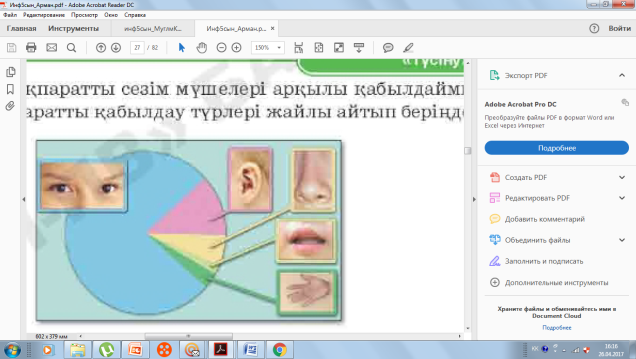 «Бірге ойлаймыз» Білу кезеңі: 1.Ақпарат деген не? 2. Ақпараттың қандай түрлері бар? 3.Адам ақпараттың қандай түрлерін пайдалана алады? 4.Адам ақпаратты қайда және қалай сақтайды? 5.Жеткізушіден қабылдаушыға қандай ақпарат беріледі? "Ақпарат” сөзі латынның түсіндіру, баяндау, мәлімет деген ұғымдарды білдіретін informatio cөзінен шыққан.Қазіргі кезде ақпарат күнделікті тұрмысқа, ғылымның әр түрлі философия, экономика физика, математика, информатика т.б салаларында кеңінен енді. Ақпаратты біз жазбаша немесе ауызша, тіпті қимыл-қозғалыс түрінде бере аламыз. "Ақпарат ” деген сөз белгілі бір хабардың ,жаңалықтардың өткен оқиғалардың мазмұнын білдіреді. Тірі организмнің құрылысын зерттеу де бізге көп ақпарат береді. Мысалы: баласы атасына неге ұқсайды? Иттен неге тумайды? Бұл сұрақтарға гинетика ғылымы жауап береді. Ол тұқым қуалаушылық болатының, әрбір организмнің негізгі белгілері ұрпақтан ұрпаққа ДНҚ молекулалары арқылы ақпарат беріледі. Сонымен ақпарат тірі табиғатта да, өлі табиғатта болады. Ол әрқашан сөзбен ғана жеткізілмейді, яғни ақпарат алмасудың сан алуан түрлері бар, қарым-қатынас жасау, өз бетімен ойлану, зертеу нәтижесінде пайда болады. Ақпаратқа үзілді кесілді анықтама бере алмаймыз.Оны қаршаған дүние туралы және онда жүріп жатқан процестер туралы хабарлар мен мағлұматтар деп түсіyнуге болады. Ақпарат материялымен және энергиямен қатар бізді қоршаған ортаның құрамды бөліктерінің бірі болып саналады. Ақпарат түрлері Барлық ақпараттарды төмендегідей бөлуге болады: қоғамдық саясаттық-әлеуметтік-экономикалық, ғылыми-техникалық, химия-биологиялық, физиологиялық т.б. Мұнымен қатар ақпарат өзінің сипаты бойынша: Түсіну кезеңі: