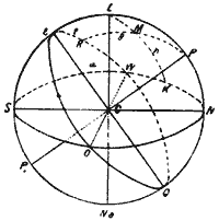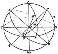 NSK= = 120o горизонтына көз тастайық, ZMK шеңберіне зенит арқылы Z және K нүктесін вертикаль саламыз, оған ИКМ = h = 30o тең деп алатын болсақ, жұлдыз М нүктесіне түседі. M және P арқылы PMR көлбеу шеңберін сызып біз сағаттық бұрыш = NEWQR, ол шамамен 275o-ке тең болады және = NRМ ауытқуы шамамен +40o-ға тең болатын шамаларды аламыз.