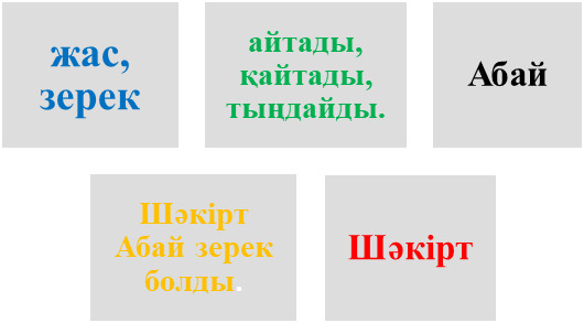 Сөздерді ұқсас түстері бойынша сәйкестендіре отырып, бес жолды өлең жазады. 1.Зат есім 2. Сын есім (2) 3. Етістік (3) 4. Сөйлем (4сөзден тұратын) 5. Синоним