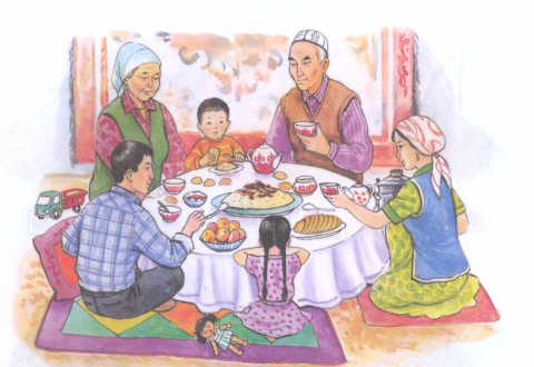 Суреттерді талдай отырып, сабақтың тақырыбы ашылады. (Тақтада оқушыларға арналған оқу мақсаты жазылады.) Оқылым дағдысы. 1- тапсырманы кезекпен оқып, аударып шығады. Тапсырманың соңында сұрақтар беріледі, сол сұрақтарға оқушылар оқылған тапсырма бойынша жауап береді. Төр Төр қонақ бөлменің жоғарғы жағы. Ол жасы үлкен адамдар Қонақтар отыратын сыйлы орын. Қазақ үйге келген қонақты «төрлетіңіз» «төрге шығыңыз» деп отырғызып құрмет көрсетеді. Қазақ халқында дастарханға үлкендерден бұрын отыру ұят болып саналатын. Себебі алдымен ақ сақалды ата мен ақ шашты әжені сыйлап төрден орын береді .Үлкен кісілер көпті көрген сыйлы кісілер. Қазақта төріңнен қарт кетпесін деген сөз бар. Себебі қарт тілегін айтып, батасын береді. Сұрақтар : 1.Төр қайда орналасқан ? 2. Қазақ халқы үйге келген қонақты қалай қарсы алған ? 3.Қонаққа қалай құрмет көрсеткен? 4.Қазақ халқы төрге кімді отырғызған? 5.Қазақта қарт туралы қандай аталы сөздер бар? 6.Дастарханға кім бата береді? (Оқушылар ауызша жауап бере отырып, ішкі уәжді арттыра түсенді.) 2-Тапсырма Суреттердің бірін тыңдап, ауызша мәтін құрыңыз. Мәтінде қазақша амандасу түрлері және ұсынылған сөздер мен сөз тіркестерін қажетінше пайдаланыңыз. Ұсынылатын сөздер мен сөз тіркестері: шырағым, қарағым, көп жаса, жасың ұзақ болсын, мал-жан аман ба? Дескриптор - суреттерге таңдау жасайды; - сурет бойынша ауызша мәтін құрайды; - мәтінде қазақша амандасу түрлерін қолданады; - сөздер мен сөз тіркестерін суретке қатыстырып ұлтық этикет формаларын қолданды. Кері байланыс - нені білді, нені үйренді; - не әлі де түсініксіз; - қандай бағытта жұмыс жүргізу қажет. 3-тапсырма Белсенді оқу әдісімен оқушылар шеңберде тұрады, мұғалім оқушыларға тізбектей жеке -жеке сұрақтар қояды бір бірімен сұхбаттаса отырып сұрақтарға жауап береді. -Үйгекелген қонанақты қалай қарсы аласың? -Қонақтарды дастархандағы дәмге қалай шақырасың? -Дастаханға қандай тағам түрлерін қоясыңдар? -Дастарханға шақырылған қонақтар қай жерге отырады ? -Үй иелері қайда отырады? -Сен қайда отырасың? -Атаң қайда отырады? 4-тапсырма «Ой толғау» өз ойыңызды бос орынға жазыңыз.