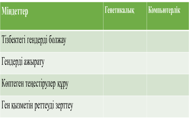 1-тапсырма. Генетикалық міндеттер мен компьютерлік геномиканың міндеттерін табыңыздар