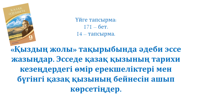 Үйге тапсырма. 171 – бет. 14 – тапсырма. «Қыздың жолы» тақырыбында әдеби эссе жазады. Эсседе қазақ қызының тарихи кезеңдердегі өмір ерекшеліктері мен бүгінгі қазақ қызының бейнесін ашып көрсетеді.