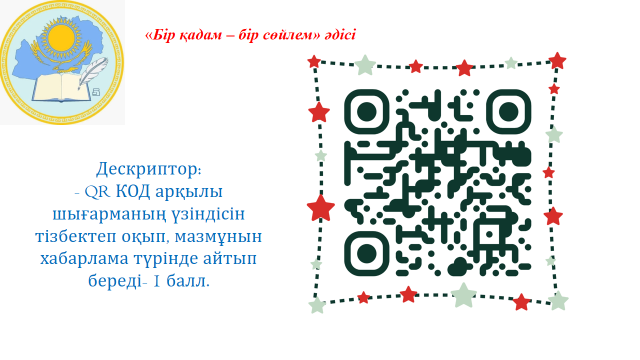 Оқушылар материалды көріп, тыңдап, маңызды мәліметті дәптерге жазып отырады. Берілген ақпарат бойынша оқушылар жауаптарын жеткізді. Дескриптор: Әр топ өздеріне ұсынылған кейіпкердің іс-әрекетіне композициялық талдау жасайды – 3 балл. Дескриптор: Оқиға желісімен шығарма кейіпкерлерін сәйкестендіреді – 2 балл. Дескриптор: Шығармада берілген портреттік суреттеулерді табады, кейіпкерлерге сәйкес мінездеме жазады – 2 балл. Дескриптор: QRКОД арқылы шығарманың үзіндісін тізбектеп оқып, мазмұнын хабарлама түрінде айтып береді- 1 балл. Дескриптор: Шығармада берілген портреттік суреттеулерді табады, кейіпкерлерге сәйкес мінездеме жазады – 2 балл. Дескриптор: «Шұғаның белгісі» хикаясын әлем әдебиетіндегі қыздардың тағдыры суреттелетін соның ішінде орыс әдебиетіндегі Н.Карамзиннің «Сормаңдай Лиза» повесімен салыстырады, сыни хабарлама дайындайды.