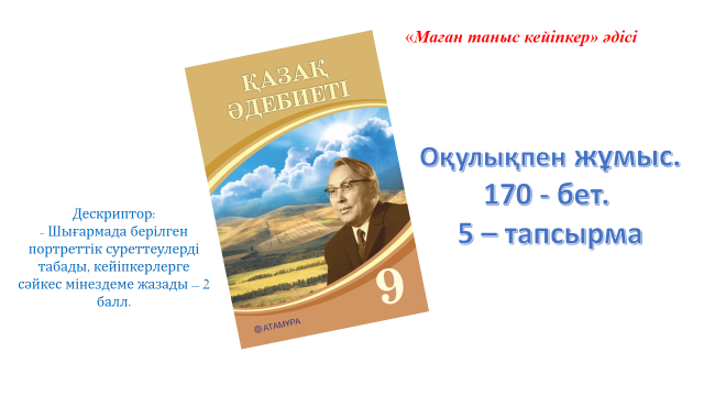 3-тапсырма: Оқулықпен жұмыс. «Маған таныс кейіпкер» әдісі арқылы шығармада берілген портреттік суреттеулерді тауып, кейіпкерлерге мінездеме береді.