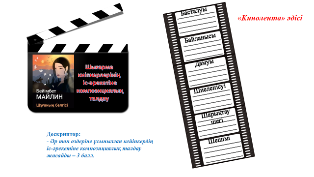 1-тапсырма: Топтық жұмыс. «Кинолента» әдісі арқылы оқушыларға шығарма кейіпкерлерінің іс-әрекетіне композициялық талдау жасау тапсырмасы берілді.