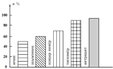 №1299. Отынның кызулығы оныц курамындагы кеміртегінін мөлшерімен өлшенеді. 8.26-суретте корсетілген баганды диаграмма бойынша сурактарта жауап беріндер: 1) Кай отынныц жылулыгы аз? Көміртегі неше процент? 2) Кай отынның жылулыгы көп? Кеміртегі неше процент? 3) Кыста уйді жылыту ушін не себепті тас көмір пайдаланады? Жауаптар