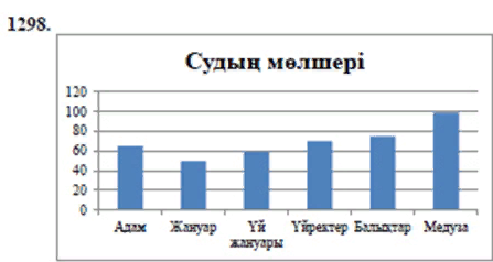 Марқакөл көлінің ауданы 455 км2, Теңіз көлінің ауданы 1500 км2, Алакөл көлінің ауданы 2076 км2, Зайсан көлінің ауданы 5000 км2. Көлдердің ауданын жүзге дейін дөңгелектеп, кестені ьолтырып, бағанды диаграмма салыңыз. Қалай ойлайсыз диаграмманың тағы қандай түрін пайдалануға болады? |