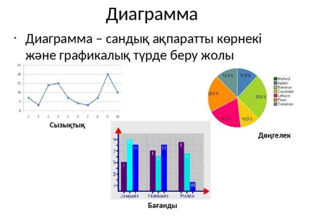 5.4.3.2 дөңгелек, сызықтық және бағанды диаграммалар салу; |
