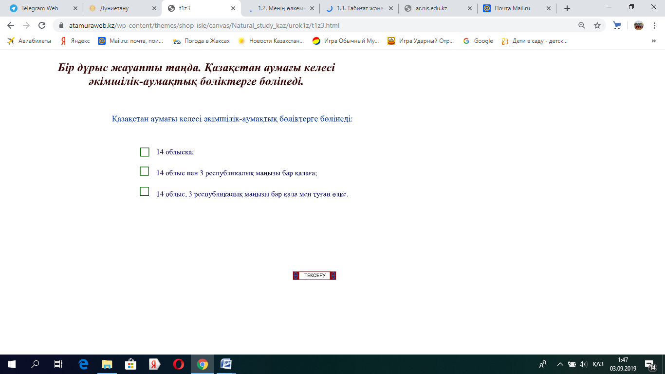 қызметі). Оқушылар картамен жұмыс жасай алады: өзінің облысын, ірі