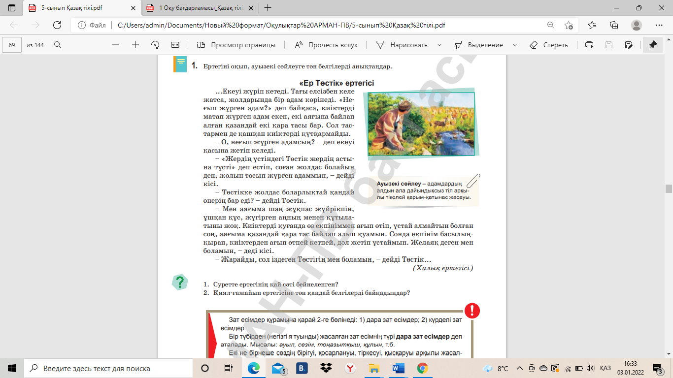 5.1.5.1 тыңдалған мәтін мазмұны негізінде сұрақтарға жауап беру, көтерілген мәселе бойынша өз ойын білдіру 5.4.2.2 зат есімдердің мағыналық түрлерін мәнмәтін аясында жалғаулар арқылы түрлендіріп қолдану |