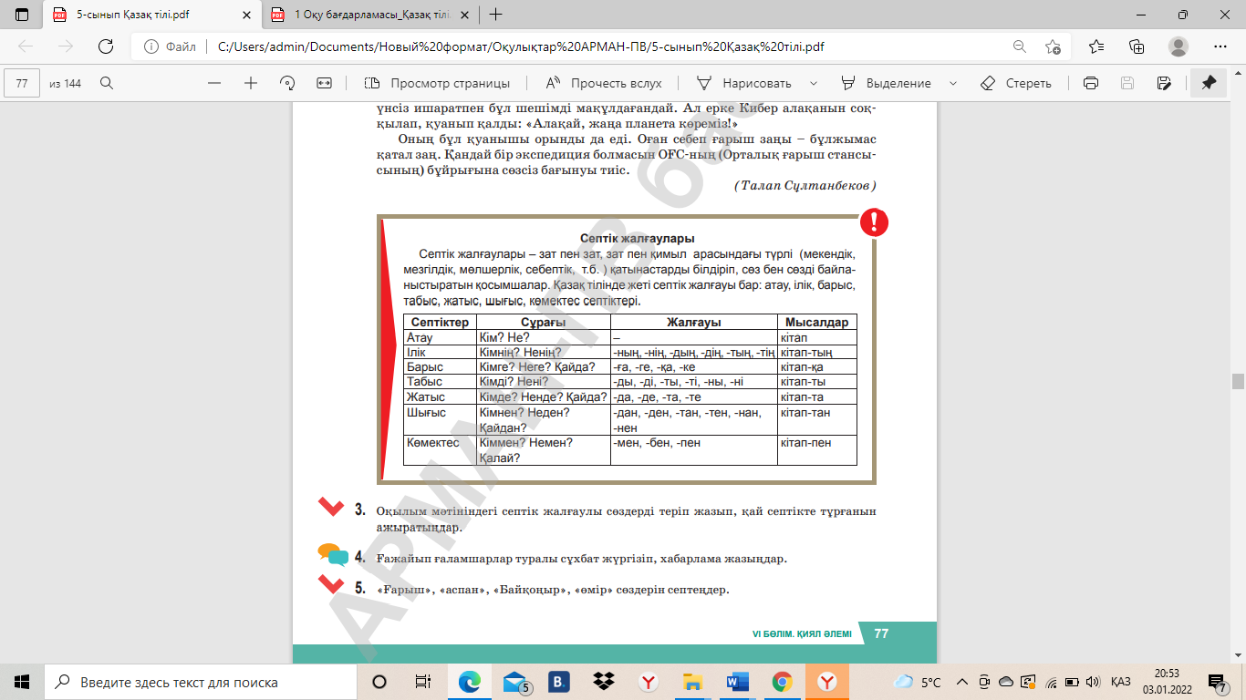 3-тапсырма. Оқылым мәтініндегі септік жалғаулы сөздерді теріп жазып, қай септікте тұрғанын ажыратыңдар. 5-тапсырма. «Ғарыш», «аспан», «Байқоңыр», «өмір» сөздерін септеңдер. Дескриптор: