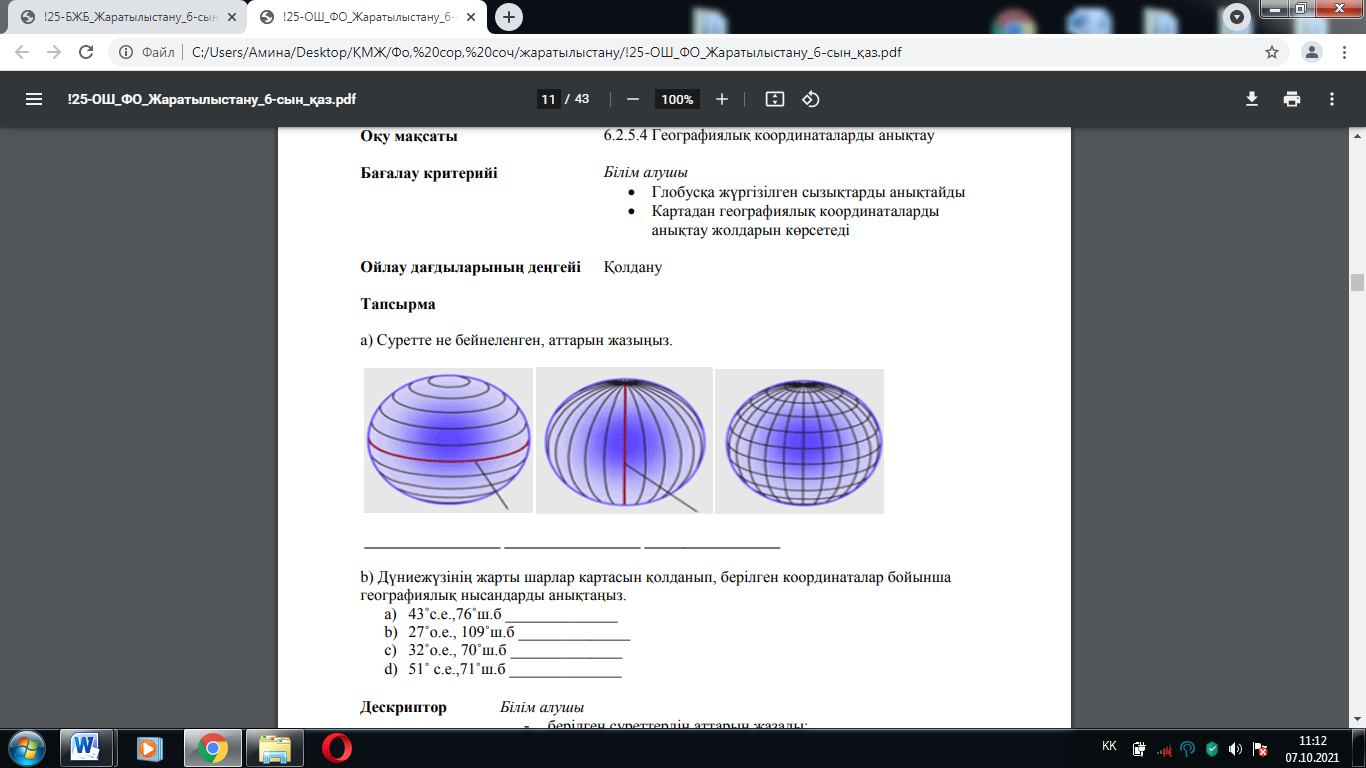 Дескриптор: Білім алушы - қалалардың ш бойлық координаталарын дұрыс анықтайды – 2 балл -қалалардың ендік координаталарын дұрыс анықтайды – 2 балл Дескриптор: Білім алушы - картадан координаталар бойынша географиялық нысандарды анықтайды – 2 балл |