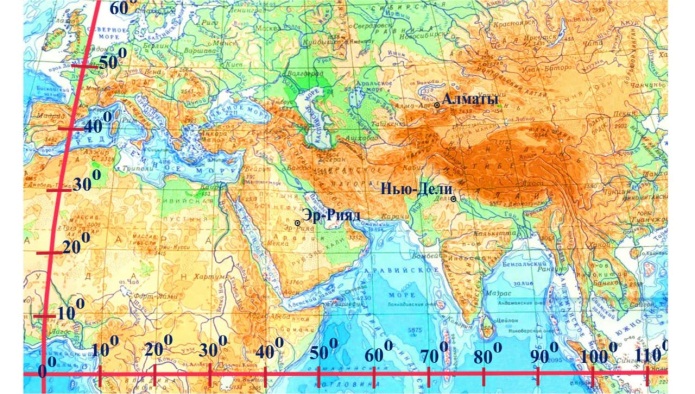 44º с.е.., 77º ш.б ____________________ 29º c.е., 76º ш.б _____________________ Жауабы: 1. Алматы қаласы 2. Нью-Дели қаласы (Үндістанның астанасы) ҚБ: мұғалімнің бағалауы |