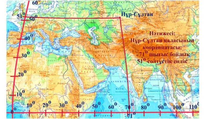 ҚБ: оқушылар бір-бірінің жұмыстарын бағалайды Жер бетіндегі экваторға және нөлдік меридианға қатысты нүктенің орнын көрсететін мөлшер (ендік, бойлық) географиялық координаттар деп аталды. Географиялық ендік – жер бетінің кез келген нүктесіне түсірілген тік сызық пен экватор жызықтығы арасындағы бұрыш. Эватордан солтүстік полюске дейін солтүстік ендік (с.е), оңтүстік полюске дейін оңтүстік ендік (о.е) деп аталады. Географиялық бойлық – жер бетінің кез келген нүктесіне түсірілетін тік сызық пен бастапқы меридиан жазықтығы арасындағы бұрыш. Нұр-Сұлтан қаласының координатасы: 71º шығыс бойлық, 51º солтүстік ендік