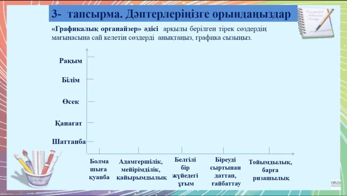 қасиеттер. 81-беттегі суреттеу мәтіні бойынша сурет салу Сұрақтар: Балалар, адам бойында қандай қасиеттер болады? - Ендеше, адам бойынан табылатын 5 жақсы, 5 жаман қасиеттерді атай қойыңдаршы. Топқa бөлу Aқылды, қaйpaтты, жүpeктi бeйнeлeйтiн cуpeттepмeн 3 топқa бөлiнeдi: «Талап», «Еңбек», «Ғылым»