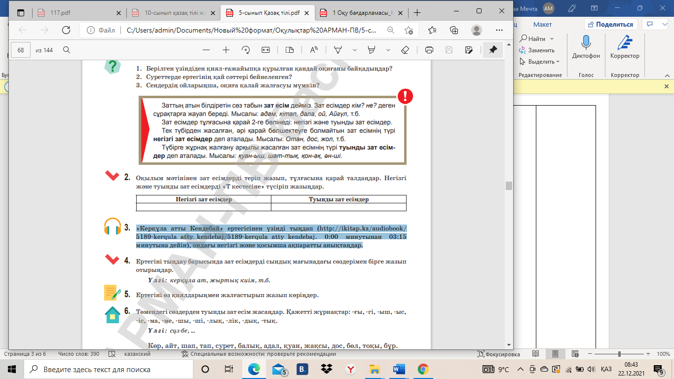 ҚБ ӘТН. 2-тапсырма. Оқылым мәтінінен зат есімдерді теріп жазып, тұлғасына қарай талдаңдар. Негізгі және туынды зат есімдерді «Т кестесіне» түсіріп жазыңдар.